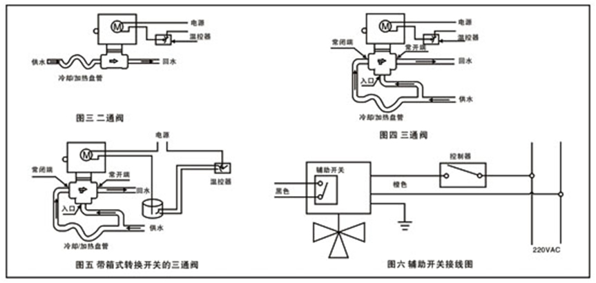常閉二通閥和混合三通閥的安裝如圖形34所示。對于高層建筑物,應(yīng)在底層支管上采用減壓閥。安裝閥體時(shí),應(yīng)注意閥體的箭頭指向,若帶有輔助開關(guān),其接線如圖6所示。